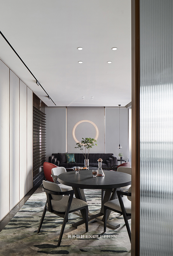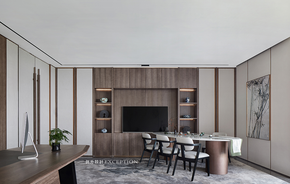 由前厅而入,空间以缥缈写意的抽象挂画开启序章,清朗简约的线条勾勒出端然有序的逸致。深沉稳重的木饰面柜体集展示与收纳于一体,同时,大理石与黄铜组合的多功能茶桌丰富空间的场景层次,营造区别于浮华浅表的东方纯粹美学。