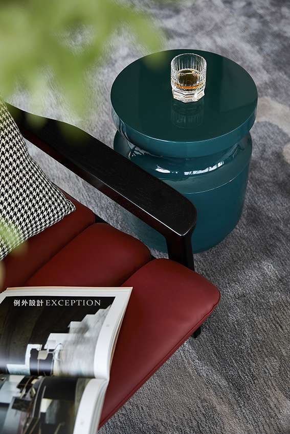 空间一角,几枝青翠融入自然的生机,绯红与典雅绿构成一幅和谐静谧的画面。肌理丰盈的山水纹几面光影可鉴,宾客间谈笑风生,来杯威士忌微醺空间的轻奢节奏,设计于细微之处关照商务精英的社交需求,独特清静的空间气度也宛若天成。