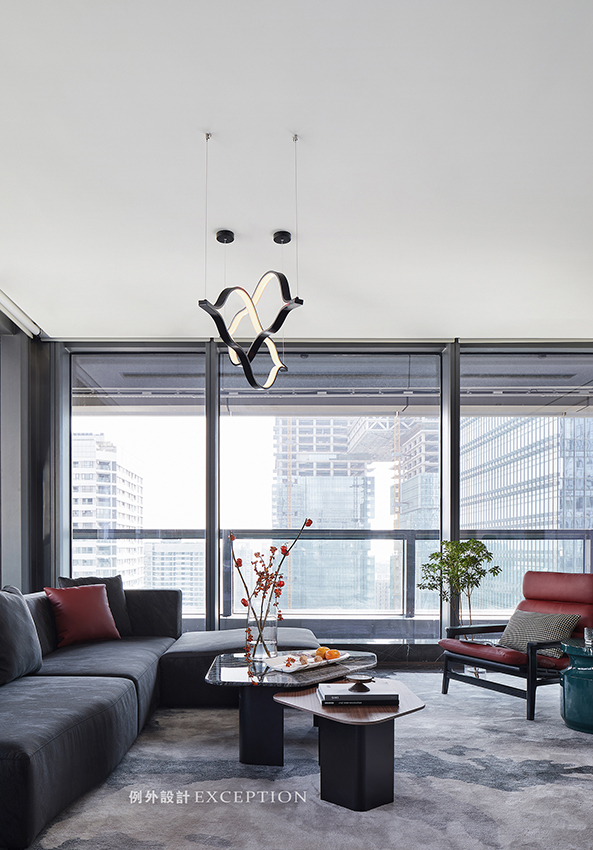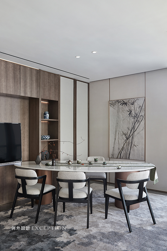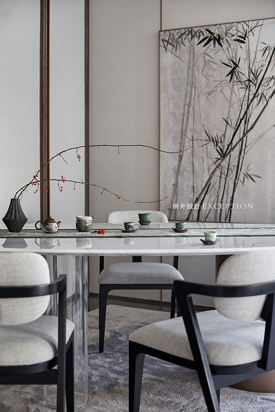 黑格尔认为,“美是理念的感性显现。”大面积水墨地毯无形中铺就一室的诗意风华,眼前沙河清丽,身后靠山长倚,传统文化所带来的美好寓意与现代设计手法结合赋予空间新的奢享体验。