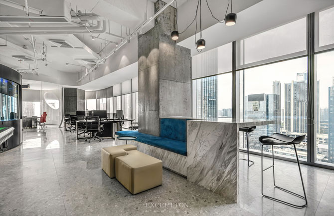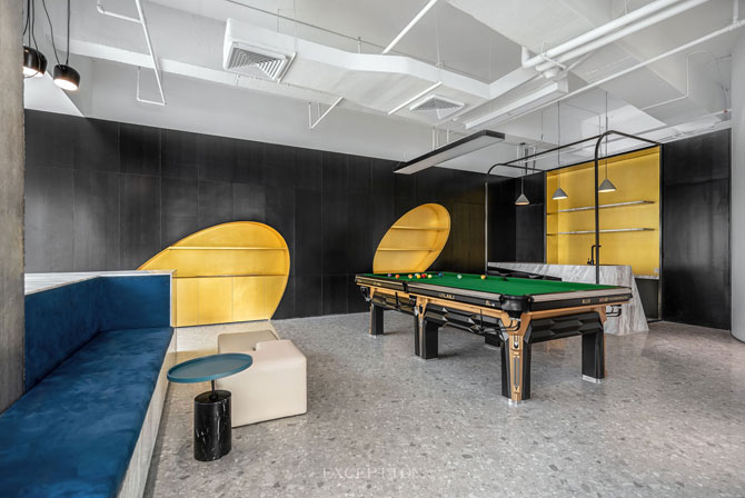 休閑區(qū)采用開(kāi)放式布局,加入卡座、橢圓物架,擺上雜志書(shū)籍,抑或是咖啡佳釀,營(yíng)造一種咖啡吧式的生活格調(diào),讓工作和生活無(wú)聲契合。金色異型屏風(fēng)搭配同色桌球臺(tái),流露道不盡的活力與品位。