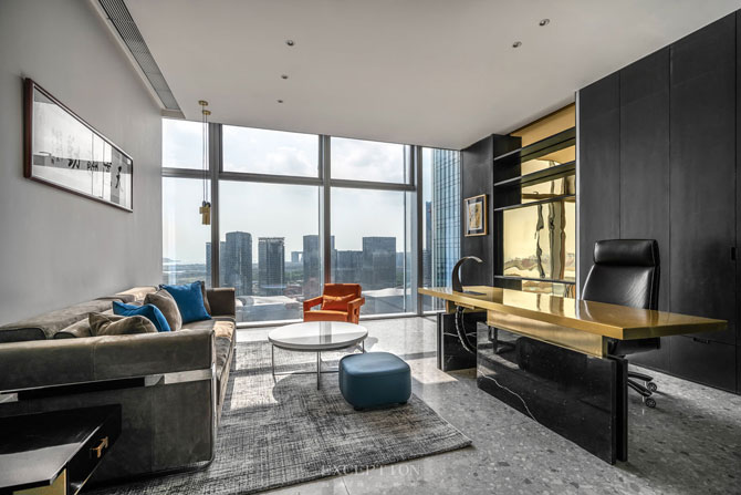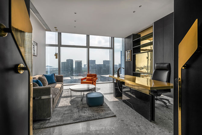 簡(jiǎn)潔、大量留白的天花墻壁,讓厚德載物的字幅更加大放光彩。辦公桌背后書(shū)柜以土黃色為主,寓意財(cái)運(yùn)與美好。書(shū)柜側(cè)邊白色燈帶化解了黑色木飾面的壓迫感,只為將貼心周到引入空間。亞克力辦公桌腿簡(jiǎn)潔有力,營(yíng)造出通透開(kāi)闊的辦公氛圍。