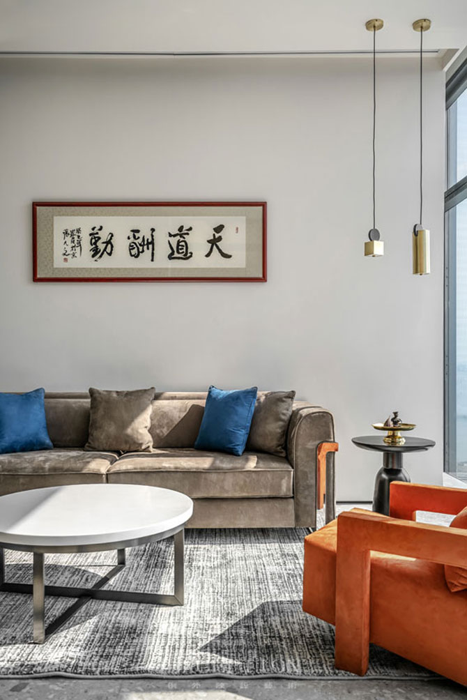 選取藍(lán)色色塊作為空間撞色,藍(lán)與金的組合,向來(lái)都是氣質(zhì)與品位相互融合的產(chǎn)物。取180°窗景作為掛畫(huà),來(lái)取代其他的裝飾,天然純凈,渾然天成。