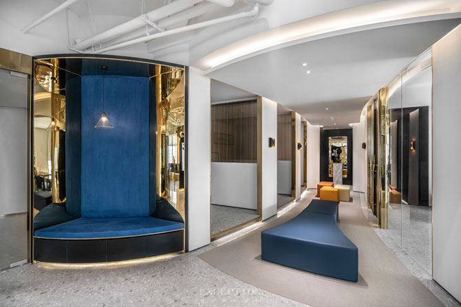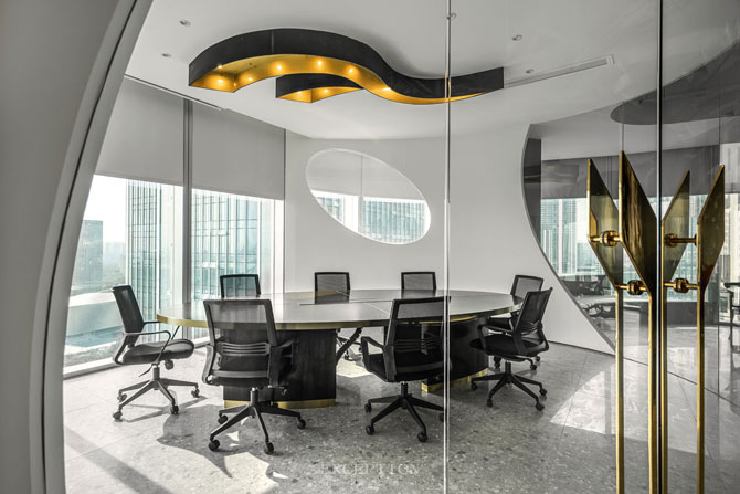 不規(guī)則圓形讓人想起東方文化里的圓融暢順,和諧圓滿(mǎn)。天花燈光靈感源自公司logo造型,豐富并深化了公司文化的內(nèi)涵。