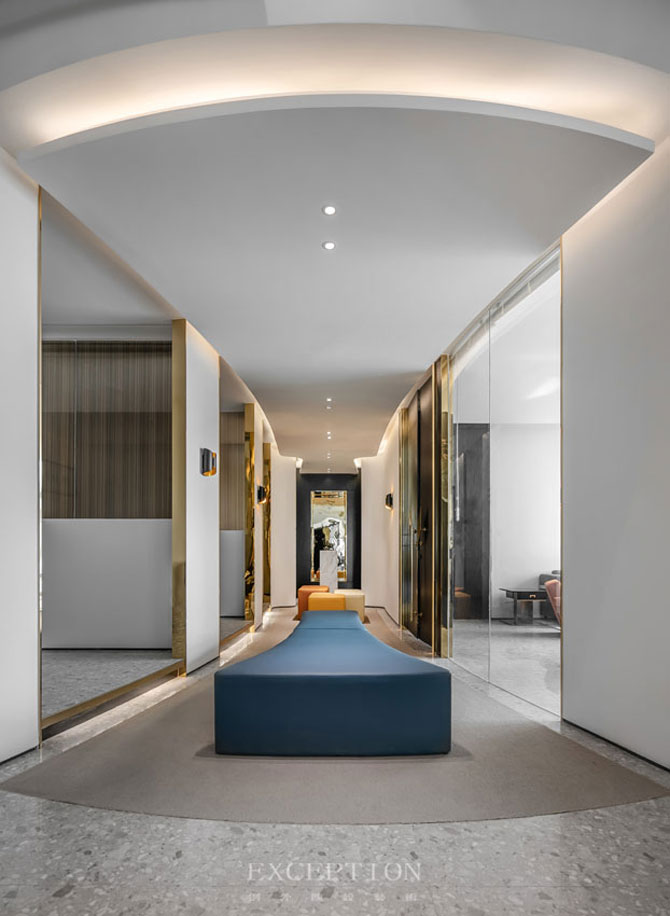 設(shè)計(jì)靈感源自戰(zhàn)國(guó)時(shí)期錢(qián)幣“殊布當(dāng)釿”。取其外形:體長(zhǎng)腰瘦、足似燕尾,首闊如梯形,打造極具形態(tài)美的空間。同時(shí),以錢(qián)幣寓意金融行業(yè),呈現(xiàn)招財(cái)進(jìn)寶,日進(jìn)斗金之意。金融行業(yè)屬金,土生金,故空間主調(diào)以土黃色和金色為主。業(yè)主長(zhǎng)于楚地,楚文化于他而言不只是一種符號(hào),更是一種成長(zhǎng)的記憶,是深入骨髓的文化瑰寶。將傳統(tǒng)錢(qián)幣文化巧妙運(yùn)用于辦公空間,在現(xiàn)代風(fēng)格的基調(diào)下,實(shí)現(xiàn)傳統(tǒng)元素與現(xiàn)代風(fēng)尚的碰撞,傳達(dá)出融匯古今、繼往開(kāi)來(lái)的美好寓意。