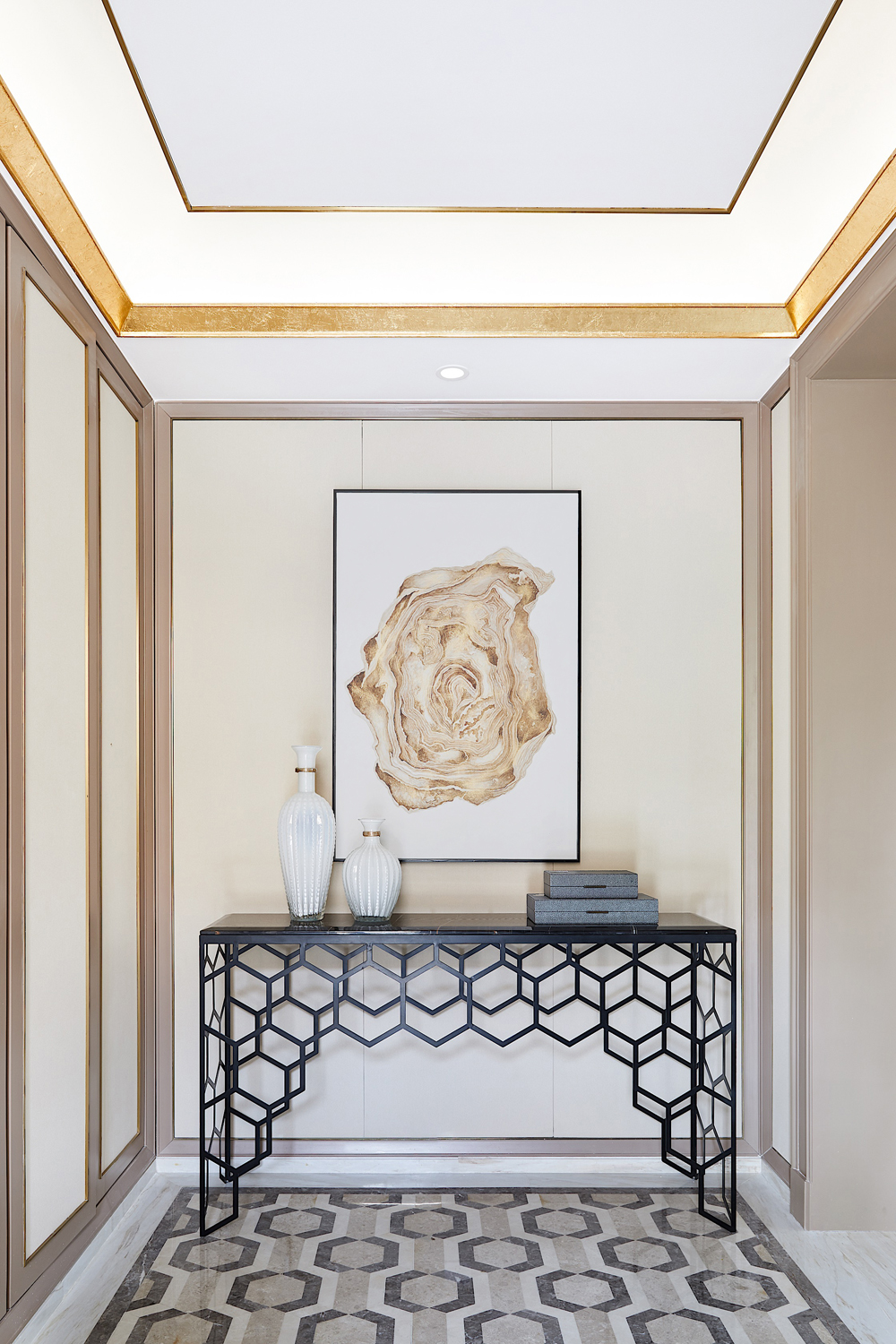 在玄關,圍繞主題展開的蜂巢造型端景臺,通過幾何變換延伸出輕盈別致的藝術性。裝飾畫似金色玫瑰優雅綻放,又仿若花蜜清瑩欲滴,恰到好處點綴了空間的視覺中心,勾勒出彬彬有禮的迎迓場景。