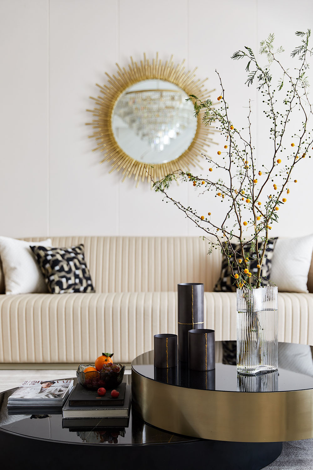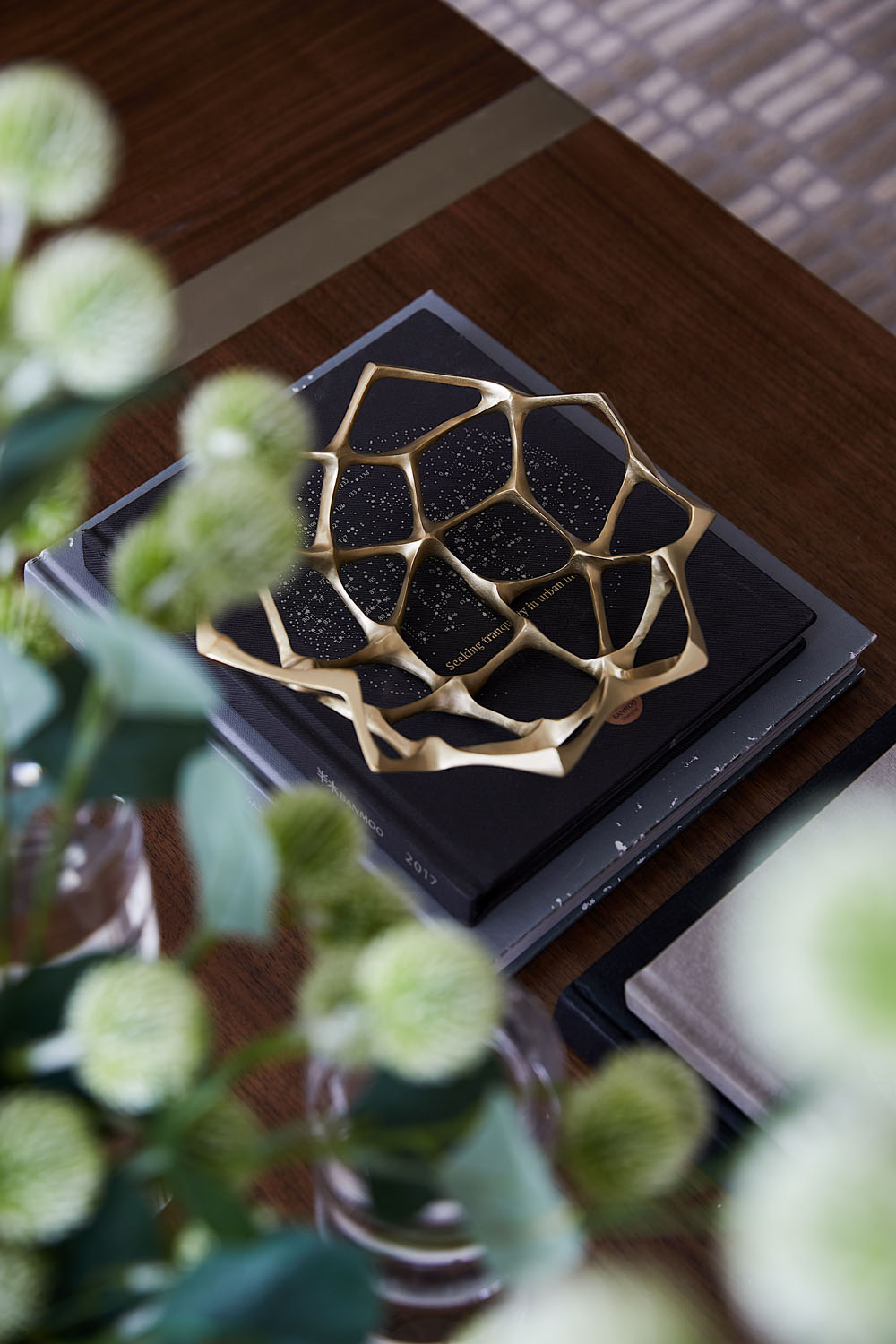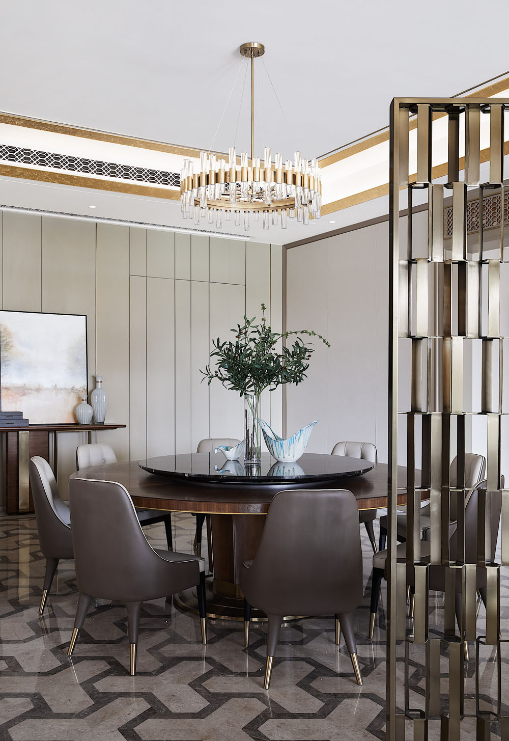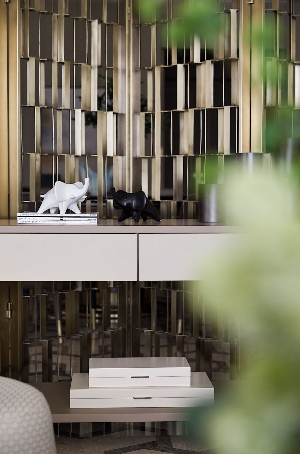“蜂巢”的靈感概念在空間不斷延續,小圓墩上的暗紋肌理依舊能看出設計所想表達的家的凝聚力和安全感。金屬鏤空隔斷增加了視覺上的層次,和質地考究的黑金碗蓮擺件一起讓家的精致氣息脫穎而出。