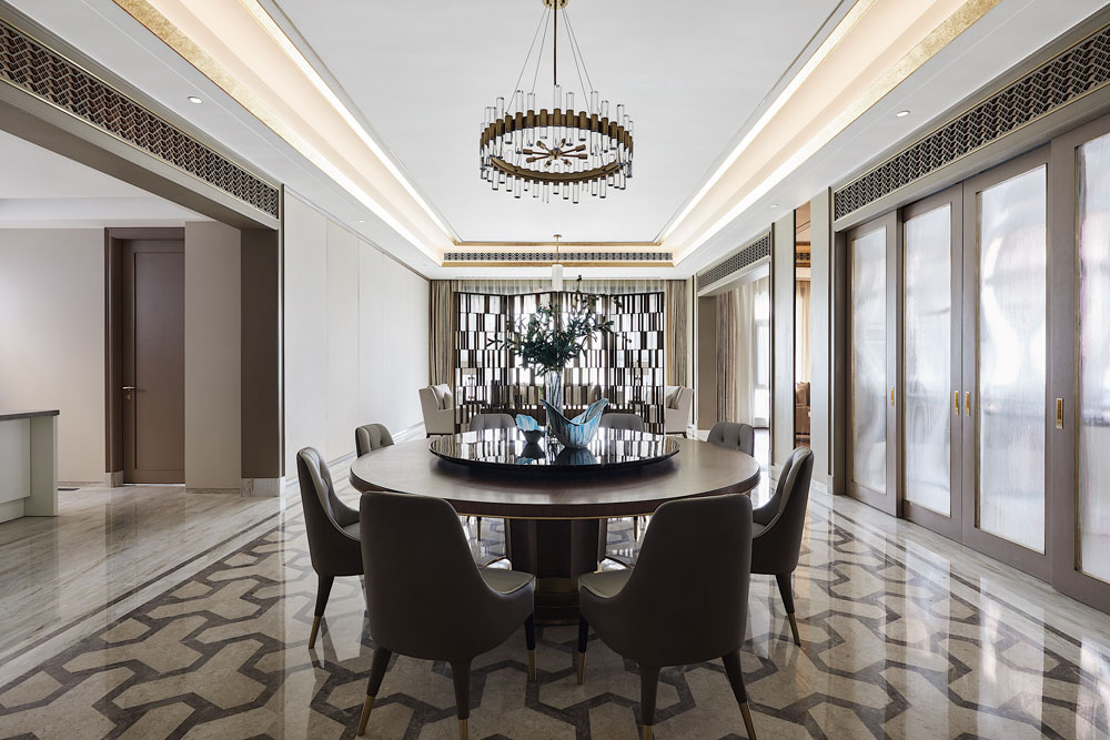 餐廳在米色的基礎上添加了更沉穩端嚴的一筆,描摹家族的餐饗禮序。美是很抽象的東西,但生活的美好模樣卻可以具象。香氣誘人的料理端上桌,一家人聚在一起,水晶燈揮灑星光如水,于高朗的情境中悠然感受人間煙火氣。