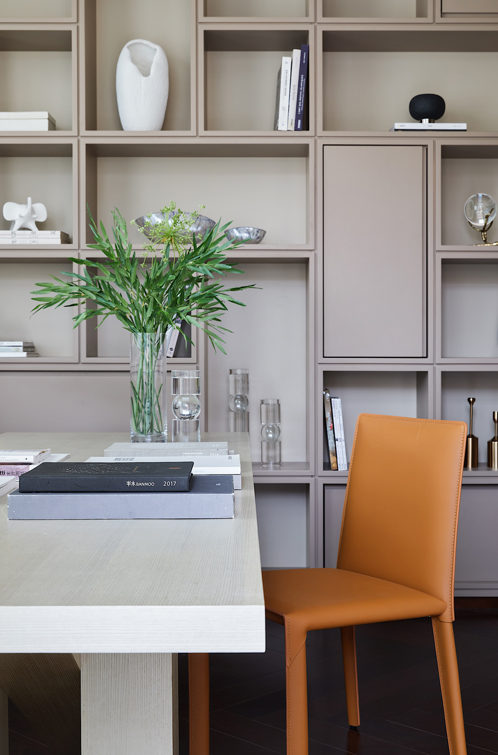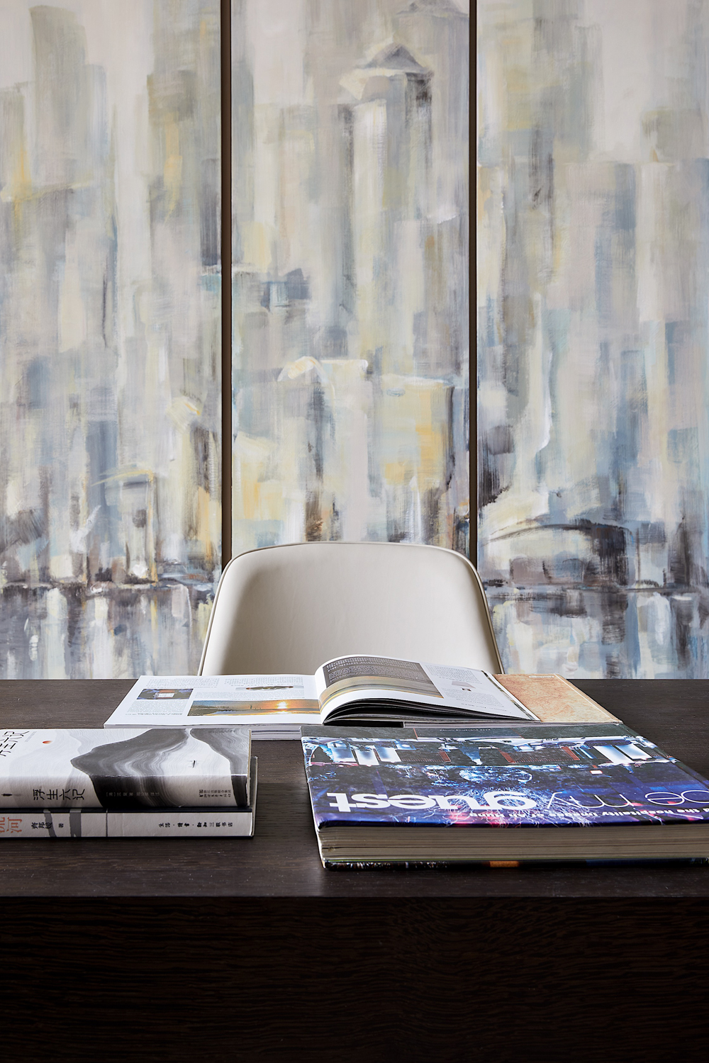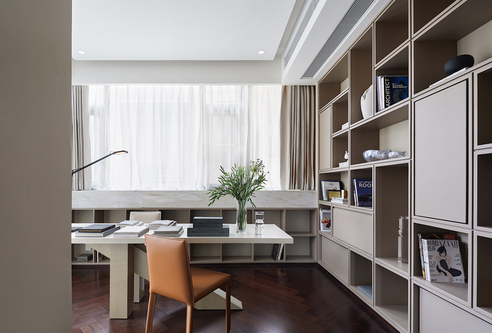 書房位于主臥套房中,空間井然有序,頂天立地式書櫥陳列著居者的藝術藏品,身后柜門上抽象手繪畫更是將溫厚的人文氣質刻畫得淋漓盡致,書中錦繡三千,任居者肆意揮灑。