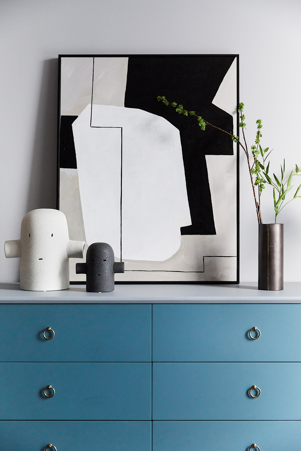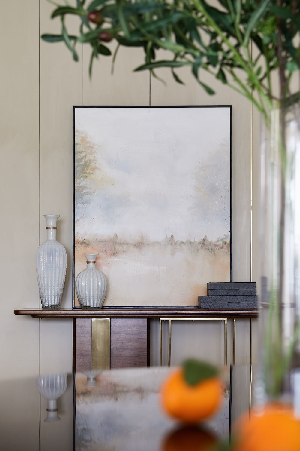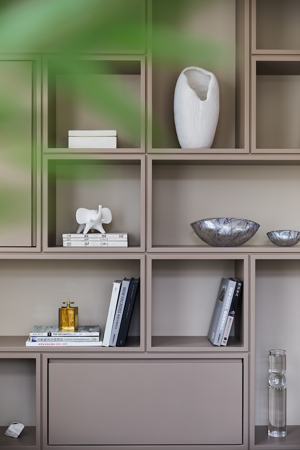書房位于主臥套房中,空間井然有序,頂天立地式書櫥陳列著居者的藝術藏品,身后柜門上抽象手繪畫更是將溫厚的人文氣質刻畫得淋漓盡致,書中錦繡三千,任居者肆意揮灑。