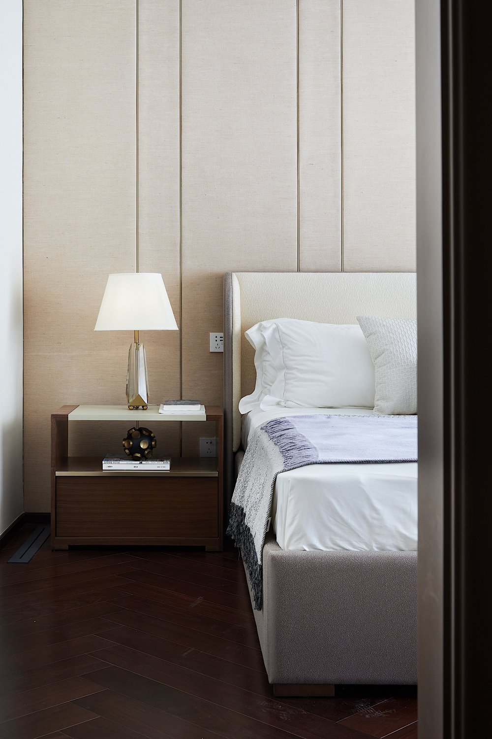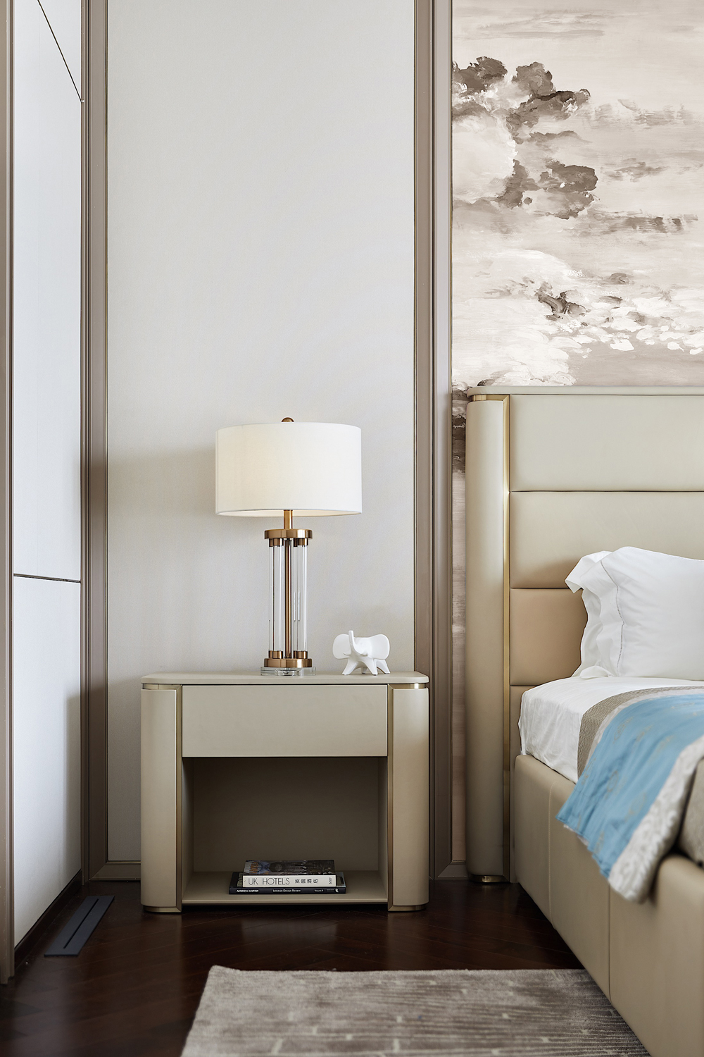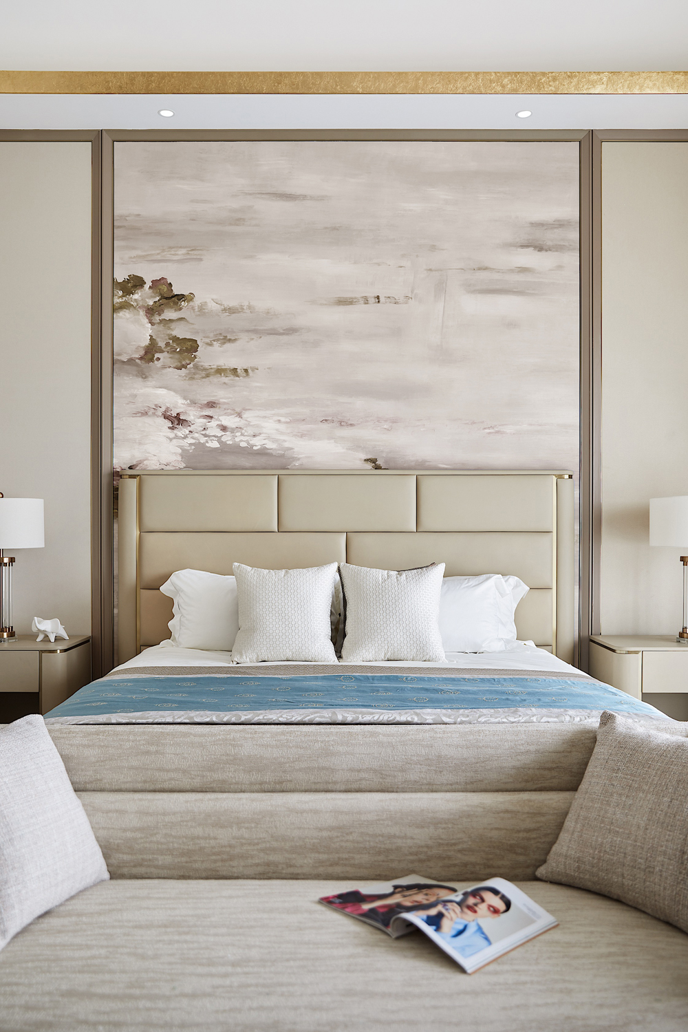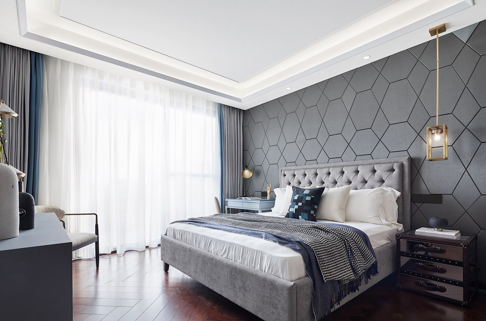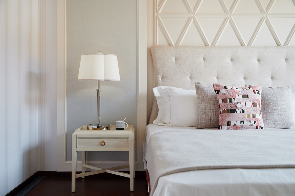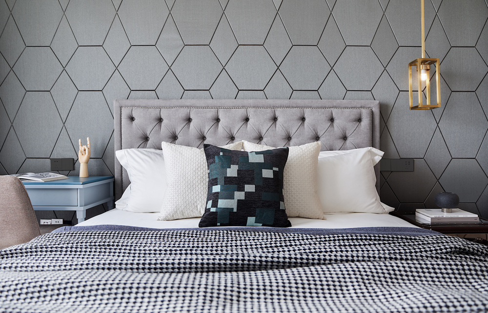 床頭以輕柔的軟包打造,趣味多元的幾何線條勾勒出個性的視覺張力,令空間在低飽和度的色彩中跳脫出輕靈的節奏感,生活與藝術在此靜謐融合。