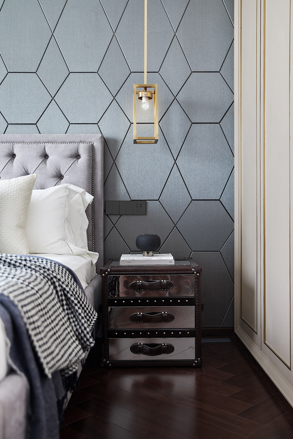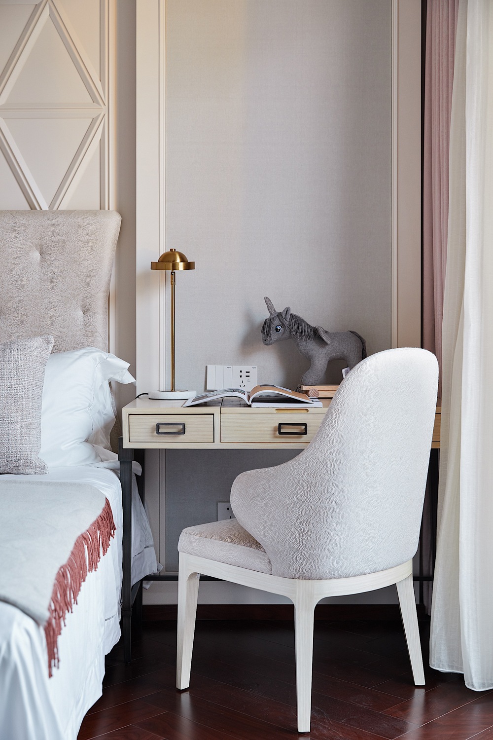 男孩房床頭背景是經過變幻后的蜂巢概念,規整的幾何排布益于孩子思維的拓展開發,不同色塊的組合與千鳥格的搭配,是一種潛移默化的美學投射,孩子自由成長不受限。