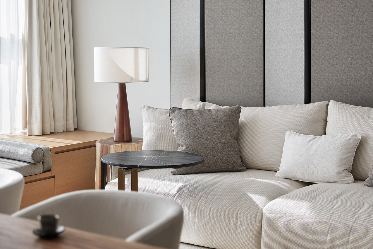 海德格尔说:“诗意的栖居,不应该只是观看的诗意,而是居住的诗意。”设计通过深浅不一的灰色打造舒适奢享的空间氛围。富于肌理与光泽的床品、造型精巧的台灯,窗台小憩的休闲场景,都经过设计师精心的考量,为居者呈现定制化的品质体验。