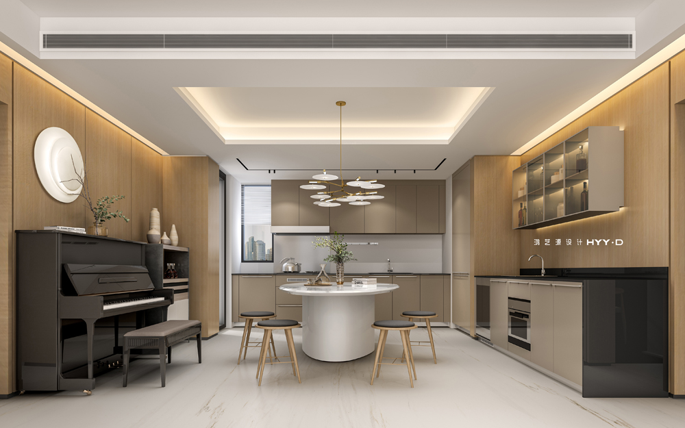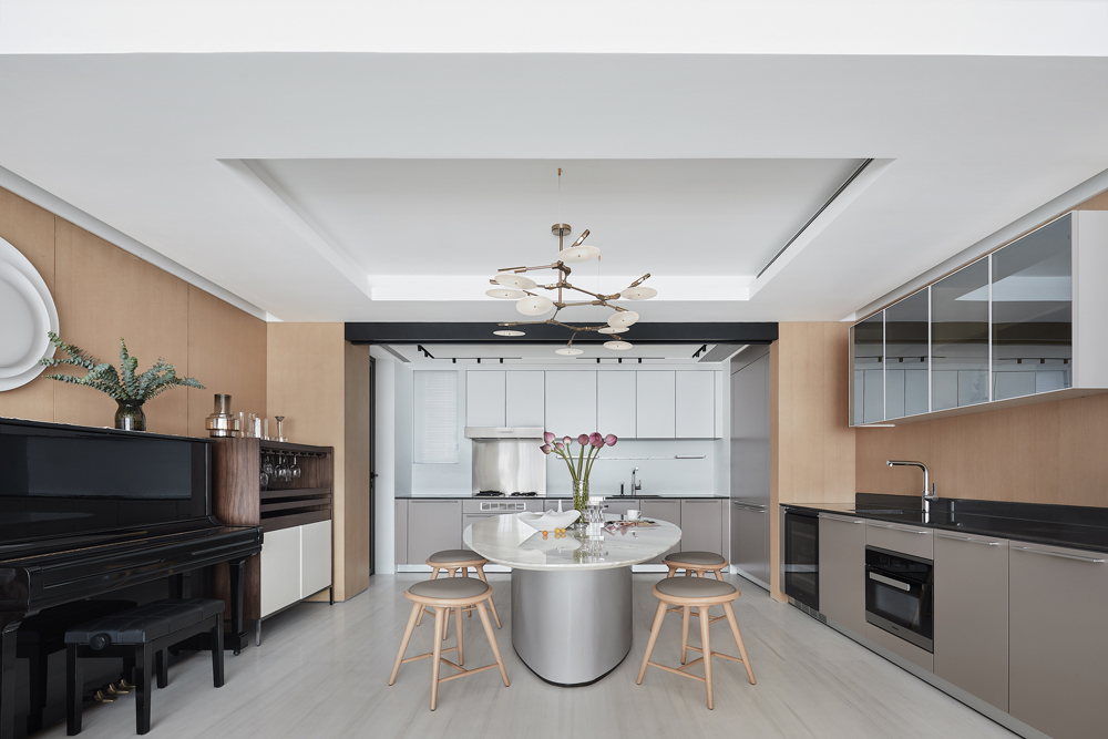 在设计师徐静看来,当设计更多地在审视空间的互动性和人的参与感时,便有了家的人情味。开放式餐厨布局增加了更多互动的场景感,女儿心爱的钢琴与简雅实用的酒柜倚墙而设,将每一寸空间利用到极致,艺术与生活于此实现了润物无声的自然交融。
