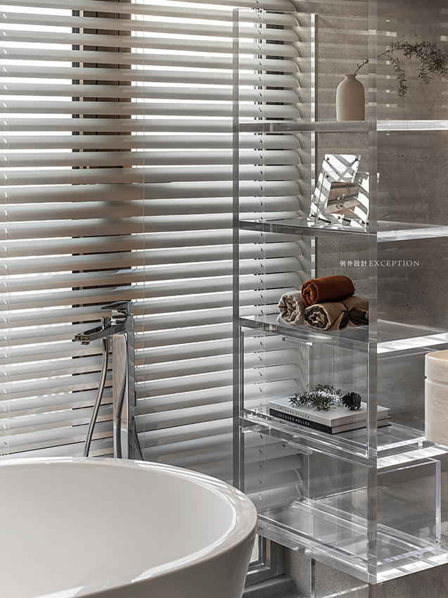 主卫以简洁清雅为空间基调,亚克力置物架通透实用,与精品卫浴一起彰显着人性化的设计考量。蓝宝石状大理石块面作为空间的点睛之笔,似大海的旖旎海浪,天空的无垠湛蓝,百叶窗外一线城景,室内水汽氤氲,一首曲调,浪漫而放松,惬意且精巧,种种美好感受都在这里慢慢生发。