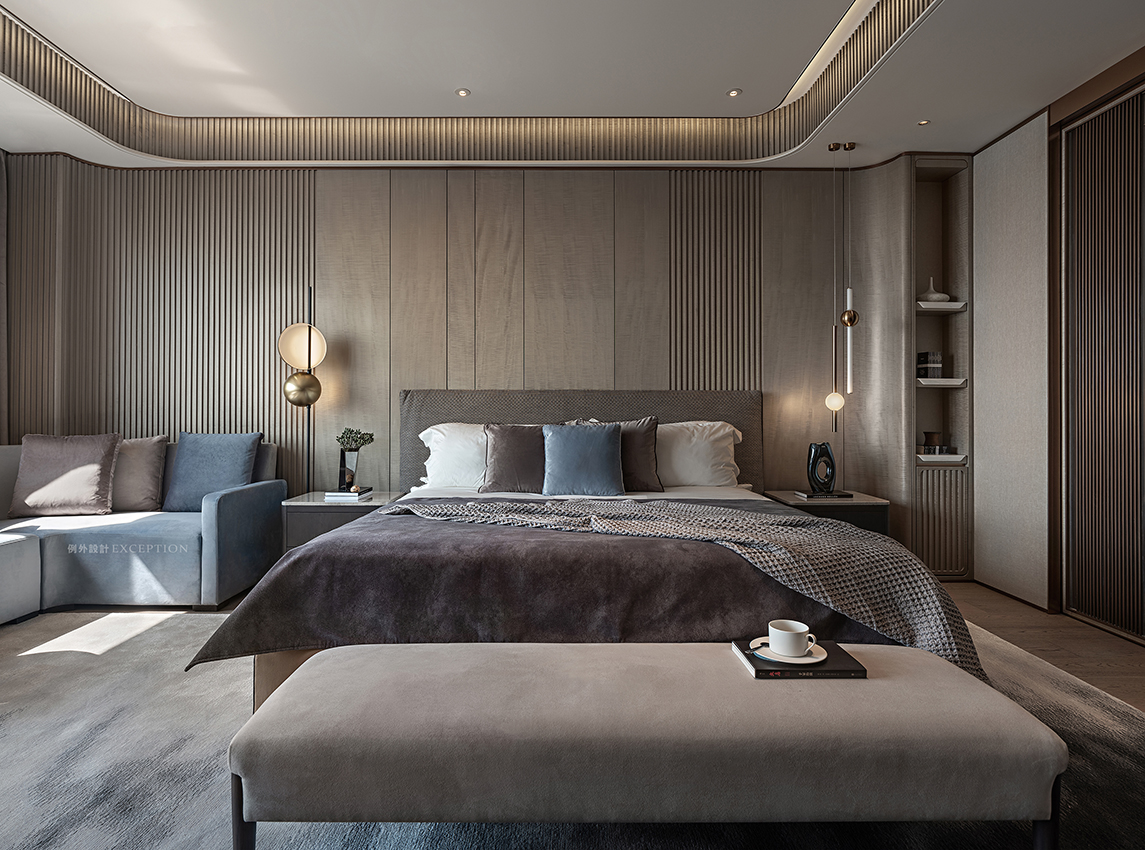 主卧作为套房空间,静奢而不失生活的艺术感。方正的格局搭配圆弧形转角沙发,为私域空间增加了丰富的生活场景。不规则金属吊灯错落有致,将空间的品质感再次提升。