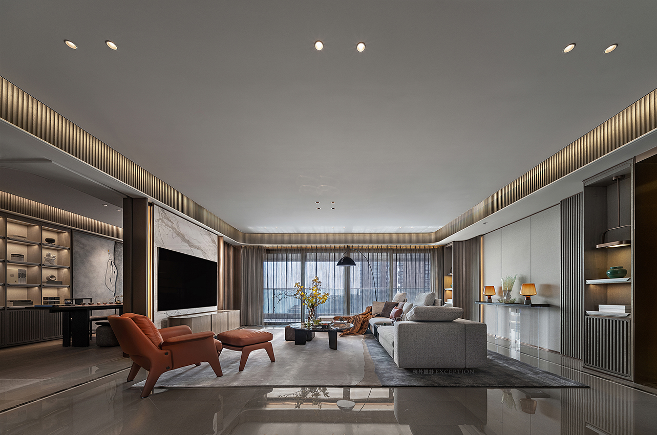 空间的设计调度抛开浮华表面,更多着墨于实用功能的完善性,一抹橙红跳色,既是温暖与关怀备至,也是品质生活的低调彰显。