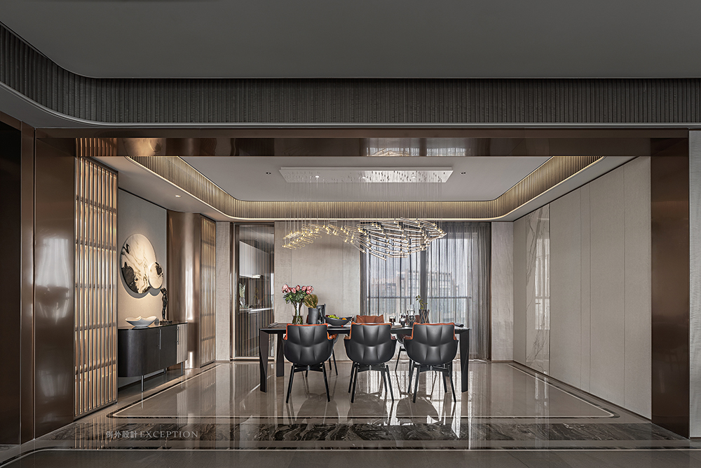 餐厅在延续整体的朗阔格局后,以不同的形式实现生活的分区,繁星点点的吊灯是自在畅游的鱼,左边圆月挂件端然静谧,右侧水墨理石纹理纵横飘逸,椅面上柔和稳重的棕红,是端然中一丝不羁的时尚,随性而不乏精致与家的温度。