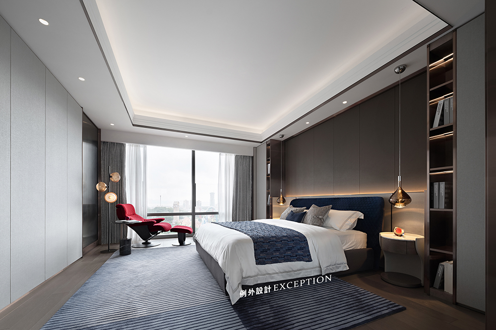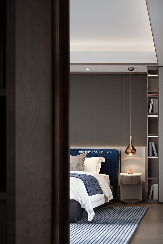 主卧在原有硬装的基础上增加了收纳柜,可以随手拿取喜欢的书籍,也可以珍藏世界各地旅行的回忆。增加了生活情调的同时,也慢慢发现更好的彼此。金属与棉麻的配搭,蓝色与橙色的碰撞,抬眼望向窗外的那一刻,室内的奢雅与自然的静美达到了平衡舒适的境地。
