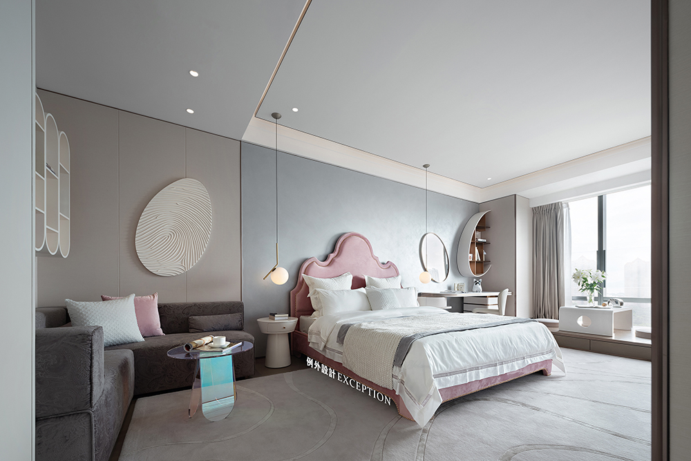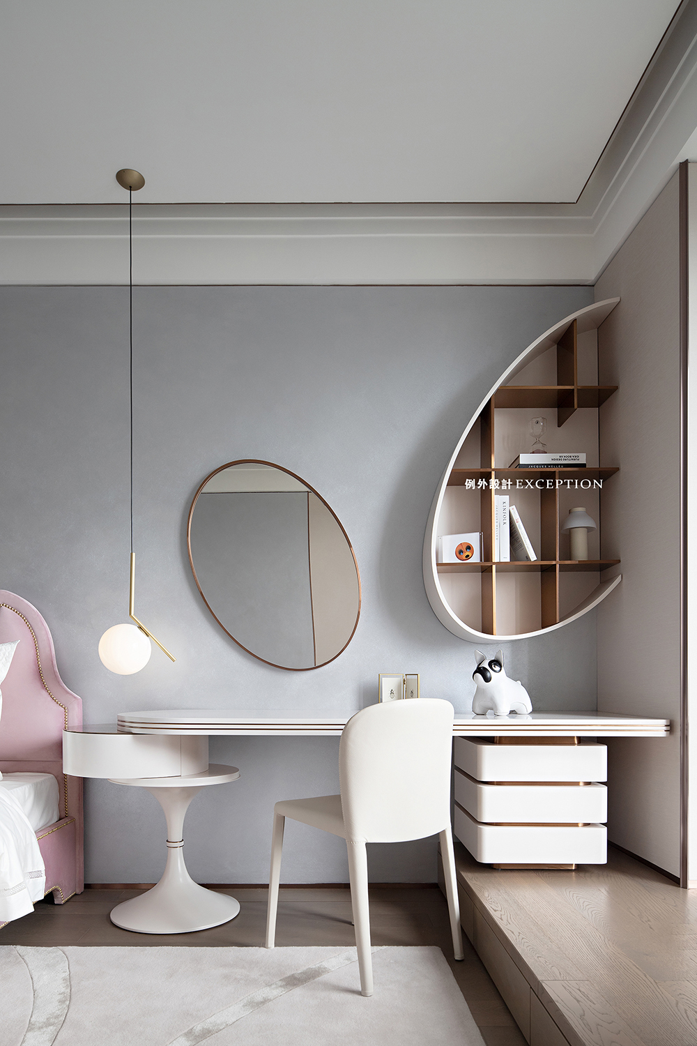 从踏入房间的那一刻起,脑海里便浮现了多功能的生活场景,视线和思绪都变得柔软起来。软饰上选用象牙白、浪漫粉、月光灰,融入几何美学,彰显女孩的柔美烂漫,让人如沐春风,闺蜜小聚、阅读闲聊,观景休憩,功能和情感之外,设计创造了额外的思考空间陪伴成长。