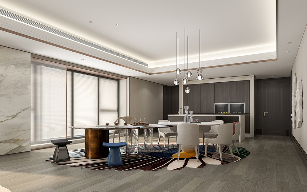 客厅空间的米灰底色低调温暖,张弛有度,弧形沙发围合出舒适通透的亲子交流场,言笑晏晏,清风徐徐,撩动纱帘,窗外的微光弥漫,远处绿树低合,依稀还能听到白鹭的清鸣。历经了万千繁华,心之归处原是家里那一隅清新宁静。