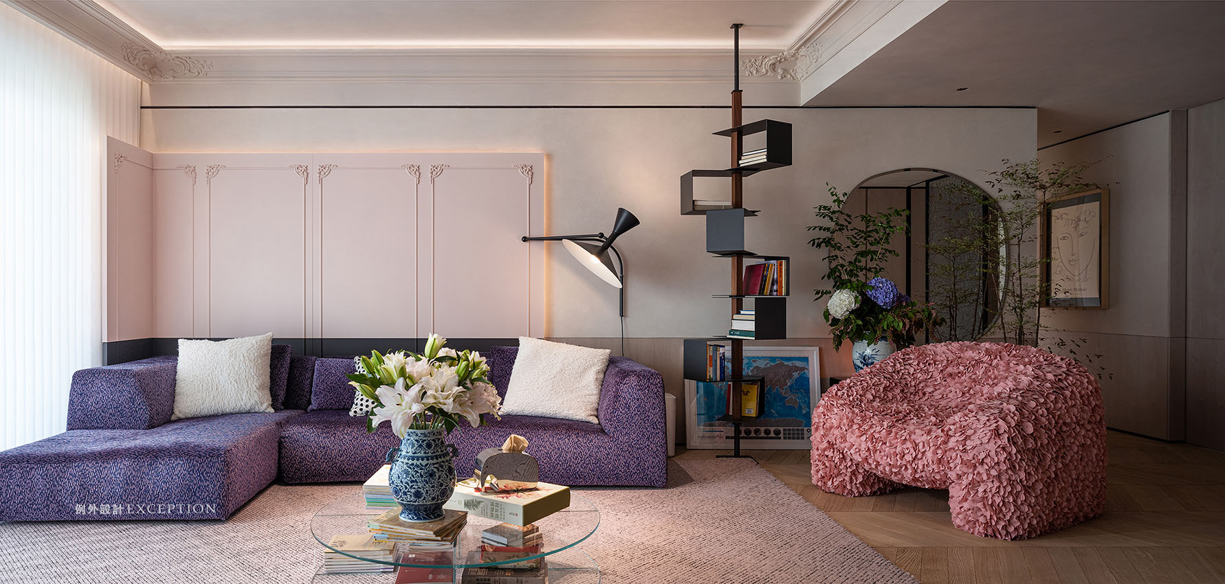 在這個家的設計過程中,設計師鄭鴻把控整體格局,關鍵詞是:簡約有質感。客廳的硬裝盡量做到簡潔,天花四周點綴了設計師徐靜喜歡的雕花,搭配肌理感的藝術涂料,干凈又有細節,所以設計的重點更多是放在靈活的軟裝上。“大自然總是能帶給我靈感,紫羅蘭優雅高貴,隨處可見的綠葉植物活力盎然,櫻花粉浪漫清新……所以我把瑰麗的自然色彩帶回了家。”徐靜說道。