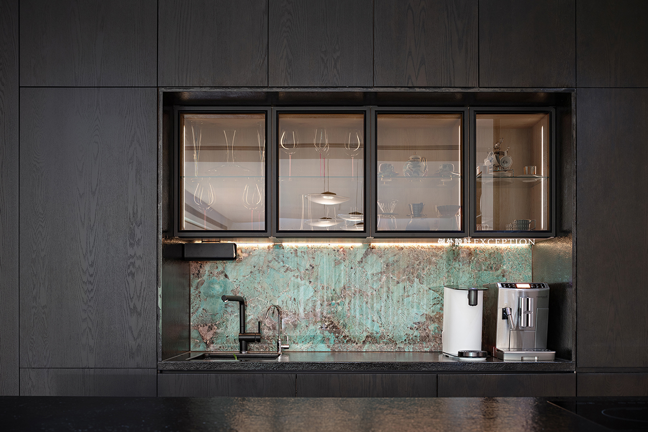 除了烤箱、水吧等必備的搭配,西廚還配備了咖啡機和恒溫酒柜,滿足了屋主每天來杯手沖的松弛時光。意興正酣的時候,夫妻倆也可以小酌一杯,漫數生活里的細碎日常。