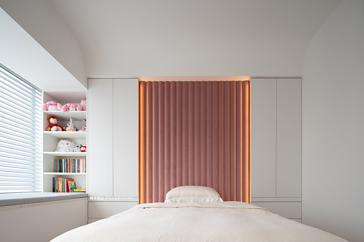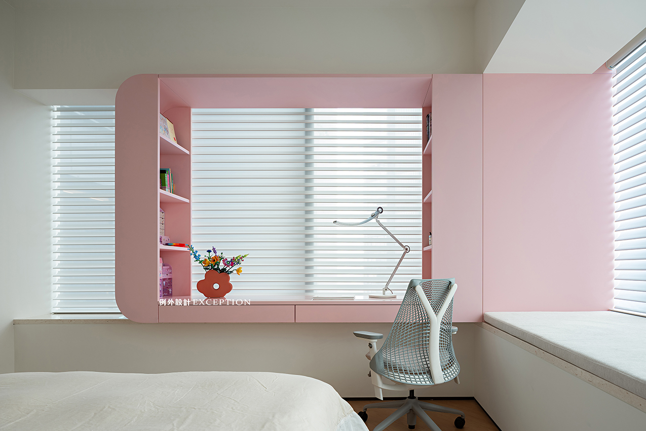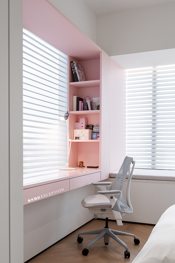 將飄窗空間作為孩子學習看書的小天地,讓有限的空間被利用到極致。隨處可見的收納設計讓空間整潔有序,粉白的配色柔化了生活的棱角,讓女孩的成長滿目陽光和詩意。
