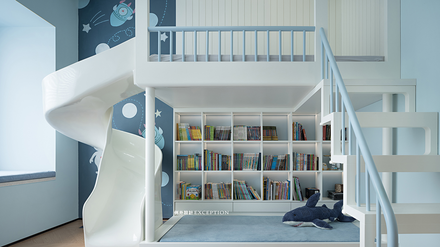 男孩房是一個充滿童趣的小宇宙,神秘的星球,充滿探索精神的宇航員,滑滑梯和睡眠區的結合是小男孩一眼愛上的,我們還配置了安靜的閱讀區,為孩子的成長注入更多的想象。