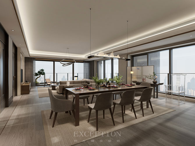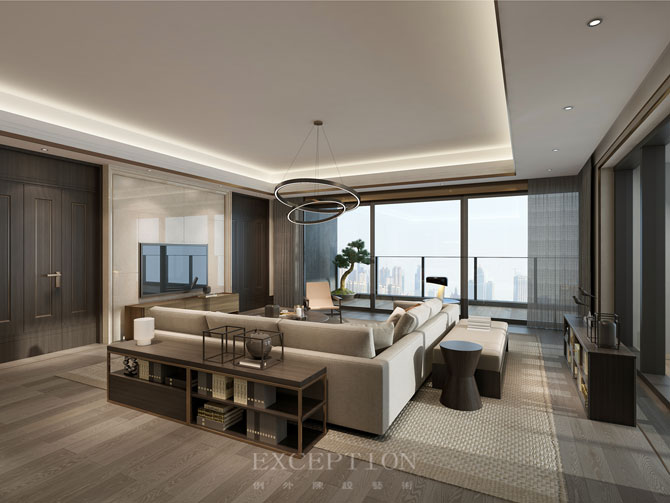 米咖的主調下,凜直干練的線條游走在邊幾、柜沿上,中式的風姿立現。松風燦陽,倚窗神思,心境開闊。
