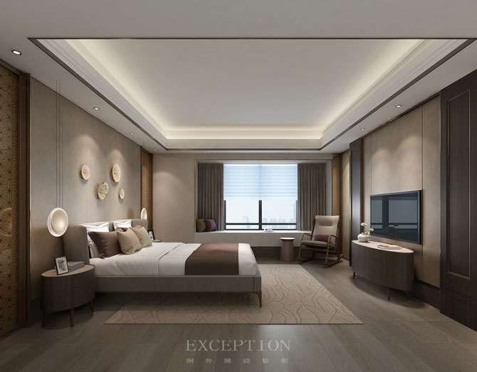 床頭背景墻上有蓮盛開,搭配月形吊燈,有一股團圓的美好涌動在室內。