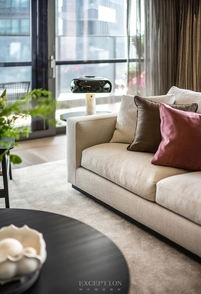 面對7米寬的客餐廳開間,設(shè)計(jì)師以亞麻與木色這樣低飽和度的色系,打造出簡雅柔和的空間韻調(diào),為日后的生活場景留足想象與施展的余地。意大利 Minotti 家具品牌沙發(fā)與實(shí)木柜搭配,在柔光下呈現(xiàn)出靜穆的美。裝飾小品不多且簡凈,幾只茶壇,幾本閑書,嘆茶翻書,便足以架構(gòu)起居住者的生活日常。