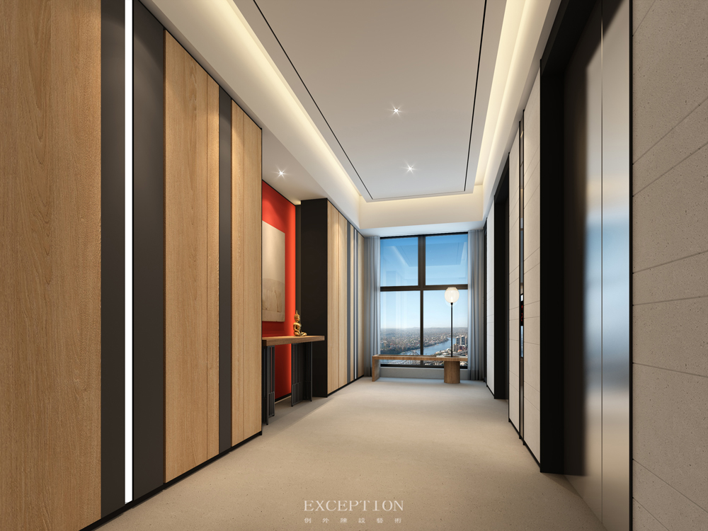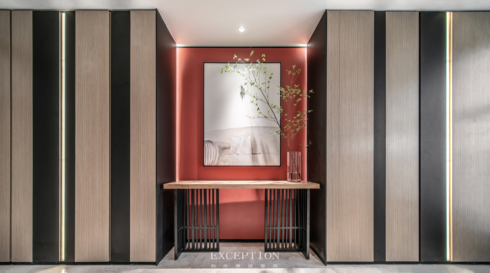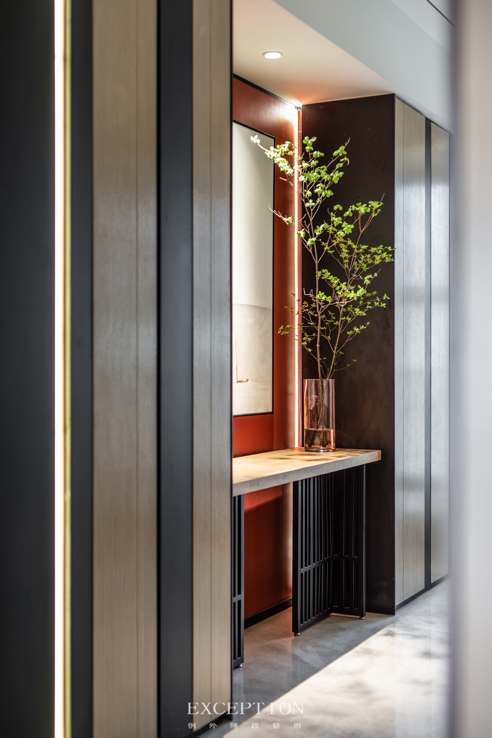 項目位于深圳寶安中心,坐收面海觀城的無邊美景,其兩梯一戶、四室兩廳的戶型設計,為居住帶來尊享體驗。步入門廳,端景以正統的朱紅色調擔起空間的儀式感,欣欣生長的枝枒為空間色彩起了緩沖的作用,在光影下顯現出清雅之韻味。