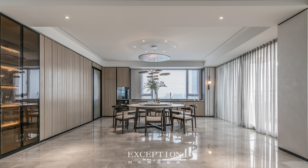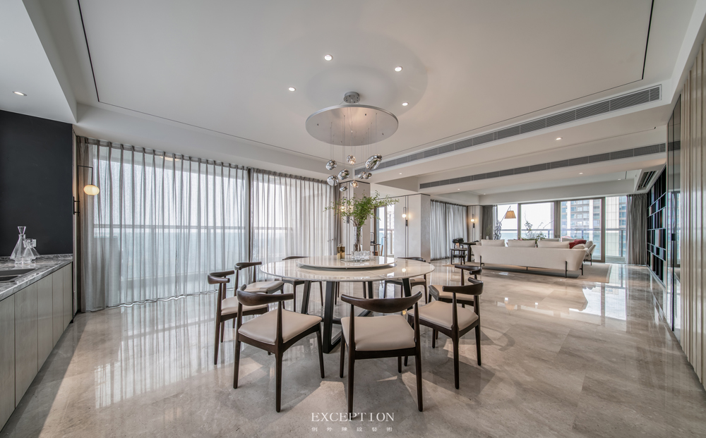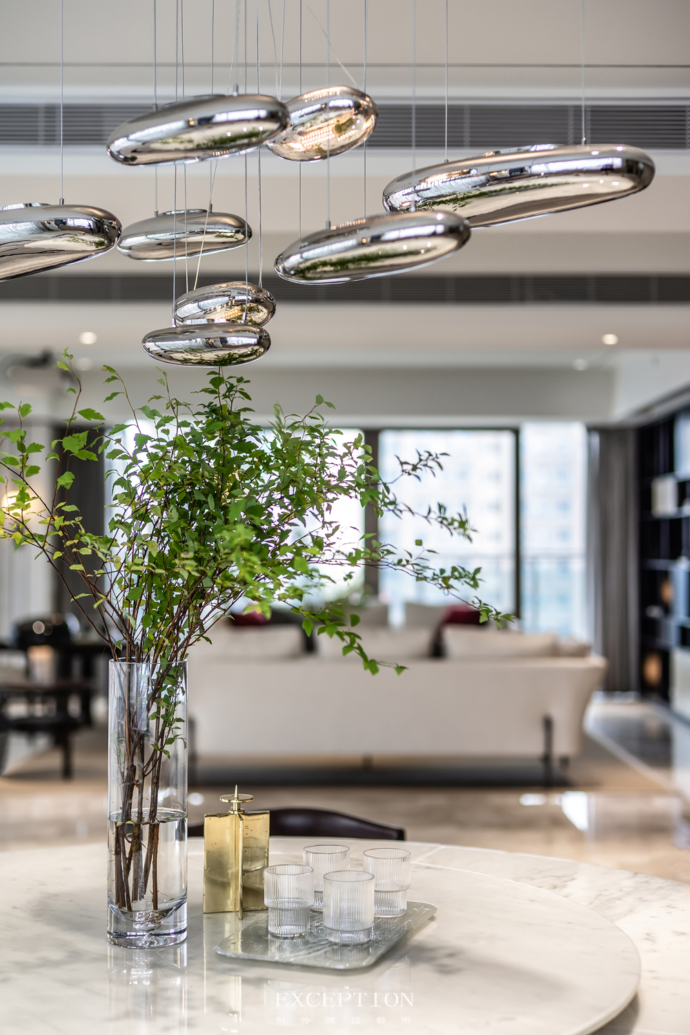 餐廳的燈飾頗有意境,像串聯一汪汪露珠一樣晶瑩透亮。可容納十人的圓桌構筑起中式餐食禮儀,朝迎曦光,暮會煙霞,四時三餐,家人們可以在這里盡情享受料理與就餐的親昵時光。