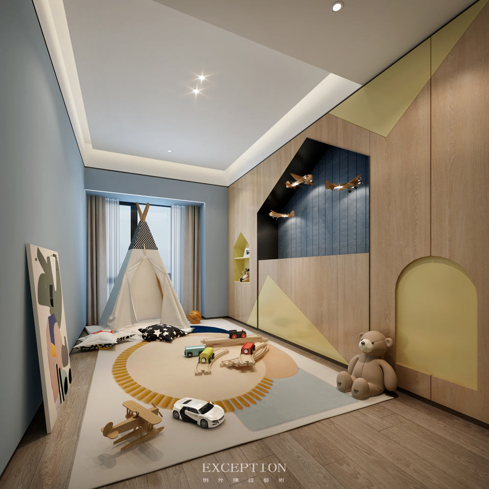 空間的裝飾頗為趣致,七巧板的多變造型、小木屋與帳篷的場景搭建、各種安全系數高的積木、火車、飛機、公仔等玩具還有畫板、童話書,豐富著孩子無憂無慮的童年時光。