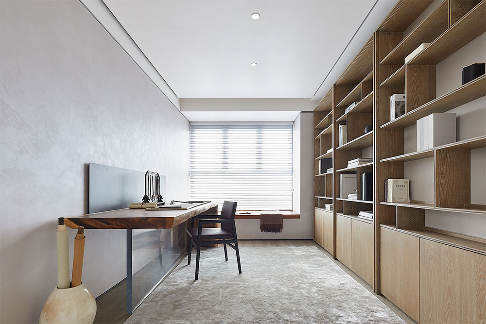 書房空間以新中式美學(xué)意涵作為空間基調(diào),營造“閣清書靜”般的閑適光景。定制的木質(zhì)書桌形制精美樸雅,亞克力與實(shí)木鑲嵌,保留木的肌理感,令空間氣韻更為靜謐,打動(dòng)人心。