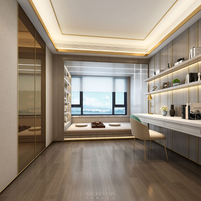 多功能房延續了線型的設計,窗前線型透光片呼應了墻面的木飾面,與對面簡潔平整的柜子形成鮮明的對比。