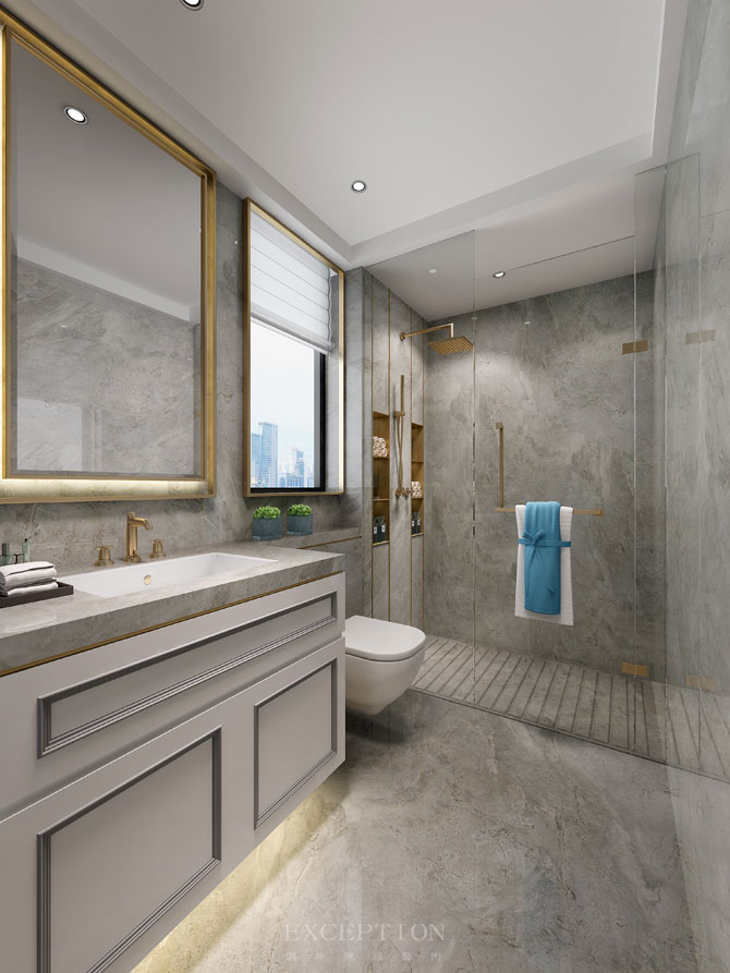 衛(wèi)生間以灰色大理石為基礎(chǔ),沉穩(wěn)大氣,同等大小的浴室鏡平衡原有窗戶(hù)的限制,空間更加和諧立體,壁龕依舊是金屬元素鋪就,整個(gè)空間似一幅精致的畫(huà)卷,在水汽氤氳的夜晚徐徐展開(kāi)。