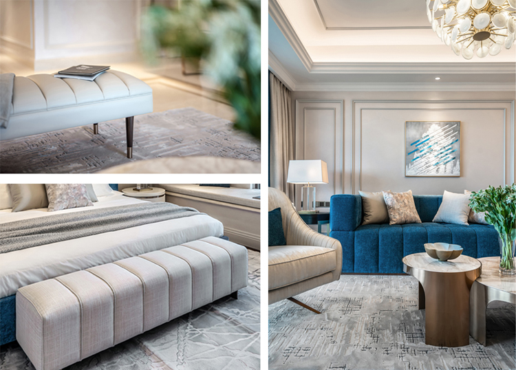 家私上選取絨布、皮革、布藝等面料,細膩親膚,凸顯之感。家具上融入金屬元素,增加時尚、精致的感覺。