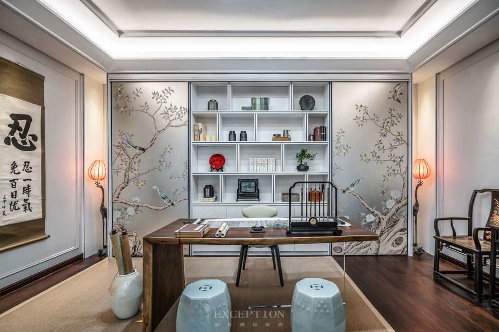 花鳥元素毫無保留地延續到書房,一體式立面收藏柜在滿足實用性需求的同時,賦予空間豐富而又飽滿的層次感。優雅的鶴型落地燈散發出溫熙的橘色光芒,鶴伴鳴琴,花鳥相望。在這里,居者熱情大度地展示著自己的日常喜好。撫琴輕攏慢捻、信手揮毫潑墨、細嗅墨韻書香,充滿生活氣息的場景如同文藝電影,慢慢講述,細水流長。