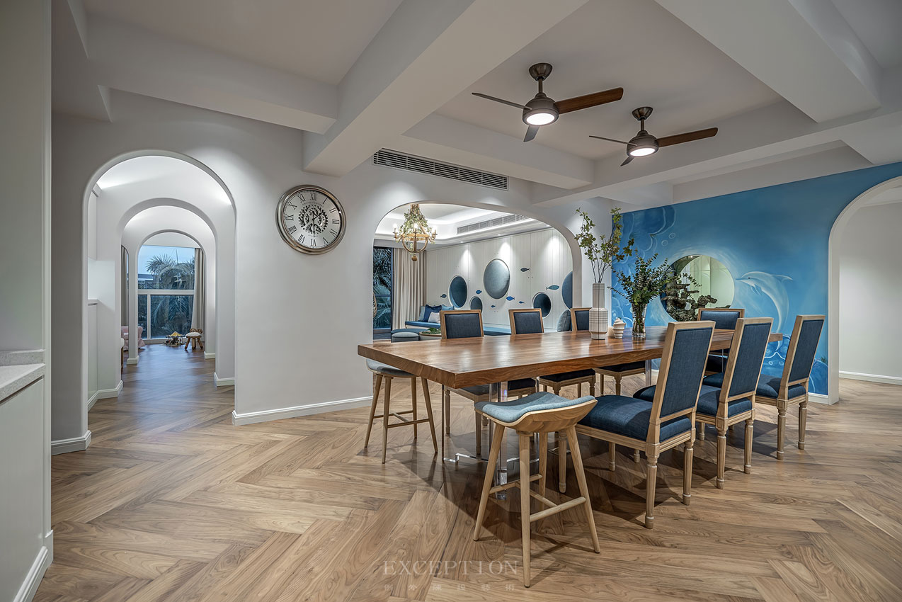 實木餐椅與海藍(lán)色完美糅合,風(fēng)扇燈葉擺動,耳畔似有溫柔的海風(fēng)呢喃,音樂聲起,美食美酒演繹浪漫晚餐旋律。