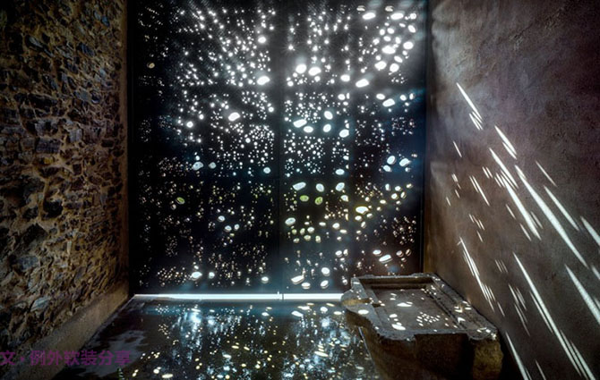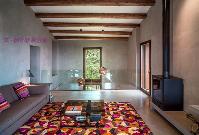 這間位于西班牙加泰羅尼亞舊農場的住宅屬于一個重建項目,這對設計師是一個極大的考驗,設計之前要對周圍環境做深入的考察分析。首先外部結構由古老的石塊構成,無比貼近自然的紋路肌理,讓人產生莫名的親切感。內部結構也十分簡約,天花板上采用原木橫梁豐富空間,地板墻面都以清水混凝土來修飾,沉迷于原始而干凈的美感。因此,在軟裝配飾上色調就相對鮮艷一些,沙發靠包選用艷色條紋絨布,而地毯則選用同色系的色彩搭配,相互輝映,吊燈采用亮鉻色的球形燈罩,LOFT的味道呼之欲出。值得一提的還有這間住宅的蓄水用水系統,將降水存儲由植被和礫石過濾后用于鮮花的養殖,極其符合現代環保低碳價值觀。