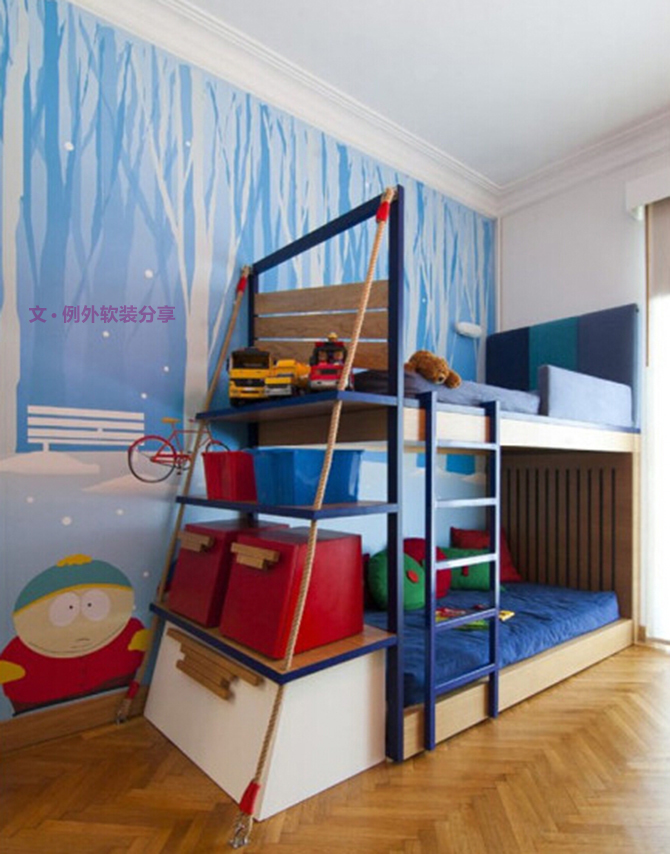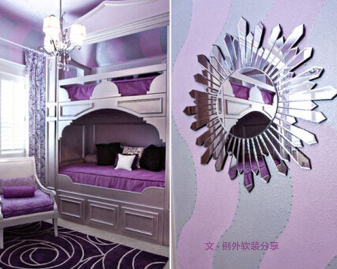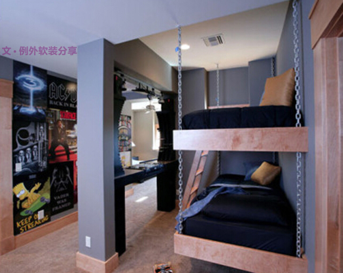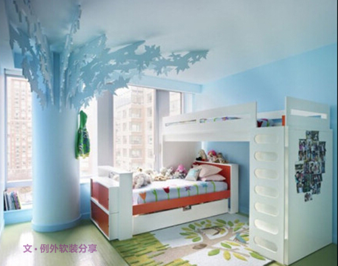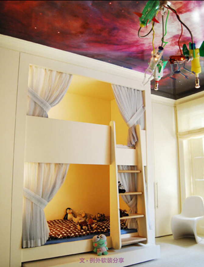 款陽光活力的黃橙搭配,幾何圖案構成一個充滿現代感的空間,簡潔實用;第二款,原木與藏藍構成的空間,尤其適合男孩子,一改常規的上下鋪設計,采用鐵鏈吊頂,帶來一股硬朗的工業氣息,個性十足;第三款清新的天藍色幻化出淡淡的童話味道,尤其是一顆人造樹生動討喜,適合年齡偏小的孩子臥室使用;不少女孩都對紫色情有獨鐘,那么第四款一定會讓你欲罷不能,紫色與銀色交織,尊貴優雅氣息十足,配上華麗的枝形吊燈,更加出彩;如果需要打造活潑熱情的感覺,那么這款珊瑚紅的便是首選,利落的幾何線條同樣適合現代風格的空間;一眼看來,第六款給人難以言喻的清新,藍綠色的搭配將森林的清新與海洋的爽朗結合在一起,韻味十足,小編表示特別鐘情這一款;喜歡白色的朋友不妨考慮一下第七款,右上角那盞創意十足的吊燈又為空間帶來幾分別致的韻味;頗具童趣的后一款適合年齡偏小的男孩子,卡通壁紙萌態十足。
