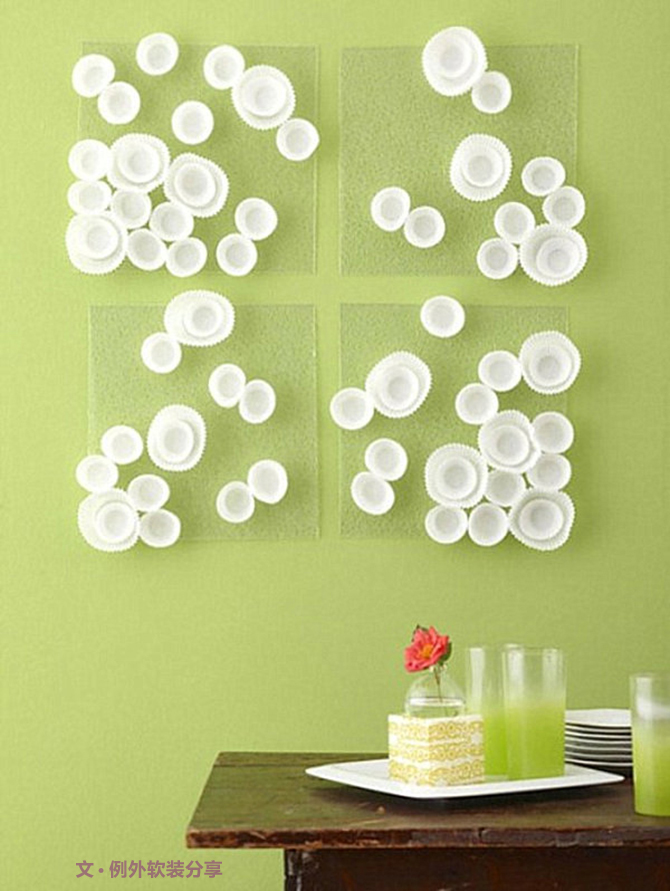 圖一:你能想象只用白紙跟圖釘就能打造出這樣一條“花帶”么,把白紙裁剪成大小不一的圓形充當花瓣,注意邊緣也要剪成鋸齒狀,同時你還可以將白紙適當彎折成適當的弧度,這樣看起來會更加神似,后再用彩色圖釘將花朵固定,選擇不同的大小錯落排列,這樣一款“花帶”藝術墻就大功告成啦!圖二:還記得你喜歡的CUP CAKE 嗎?將“紙杯”疊放、不規則排列就做成四幅一組的立體掛畫了。你一定有特別喜歡的彩色卡紙,學習圖4、5那樣包在木板表面,然后進行比例組合,就是一組漂亮的作品啦。當然,像圖6那樣的剪貼畫也是一個簡單的好方法,并且題材選取恰當還能夠充滿故事性及趣味性。