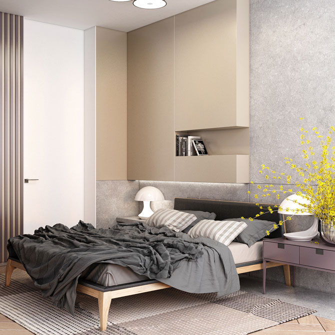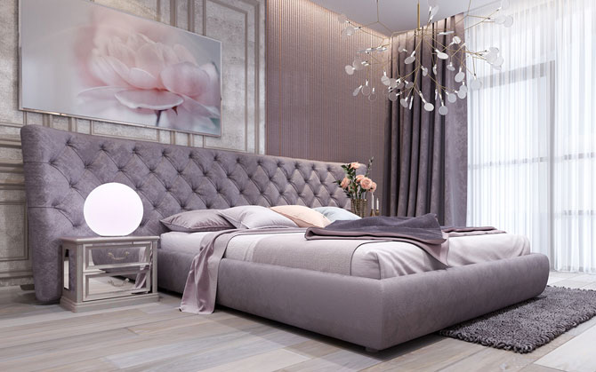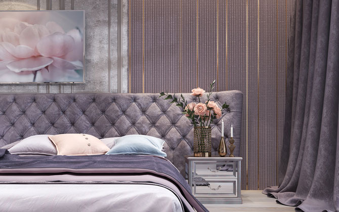 如果将灰紫色用于墙面,与床品更容易形成一个整体,空间感更强。