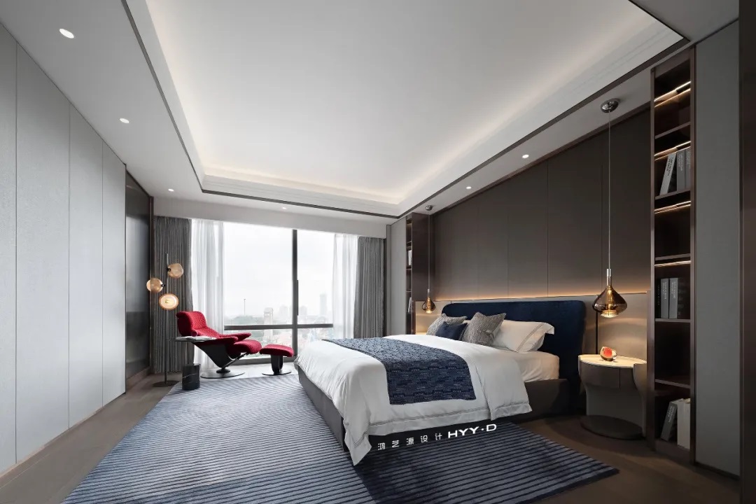 主臥在原有硬裝的基礎上增加了收納柜,可以隨手拿取喜歡的書籍,也可以珍藏世界各地旅行的回憶。增加了生活情調的同時,也慢慢發現更好的彼此。金屬與棉麻的配搭,藍色與橙色的碰撞,抬眼望向窗外的那一刻,室內的奢雅與自然的靜美達到了平衡舒適的境地。