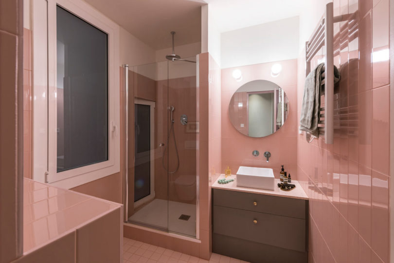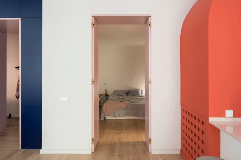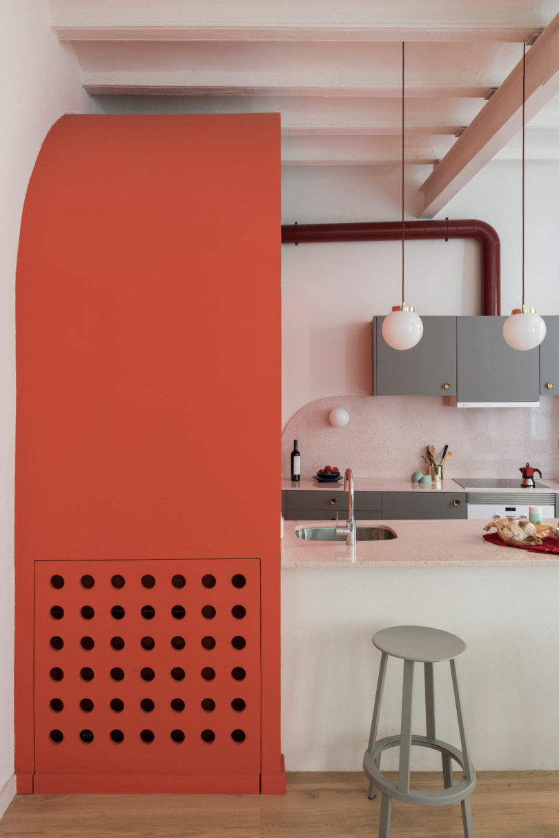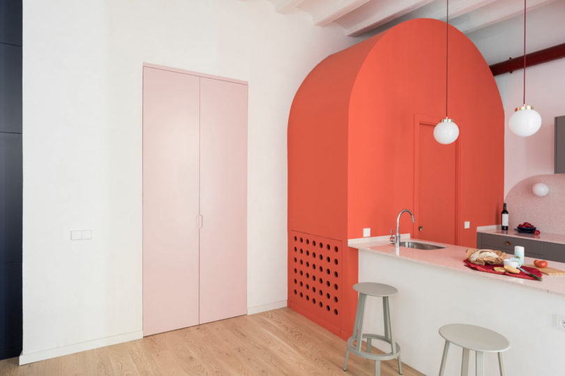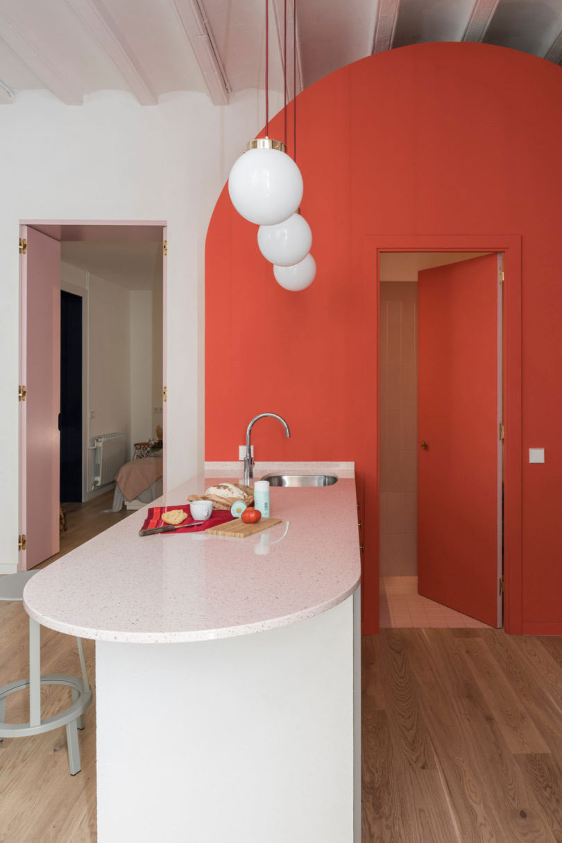 由于建筑本身具有大量的拱形元素,于是設計師在室內添加了許多的拱形元素。例如天花和衛生間,最吸睛的其實還是俏皮的空間配色。空間以定制的新家具進行呼應,加強新與舊的聯系。