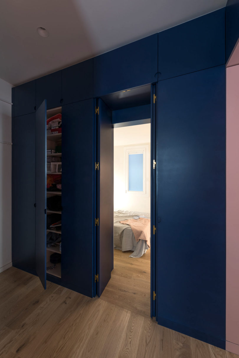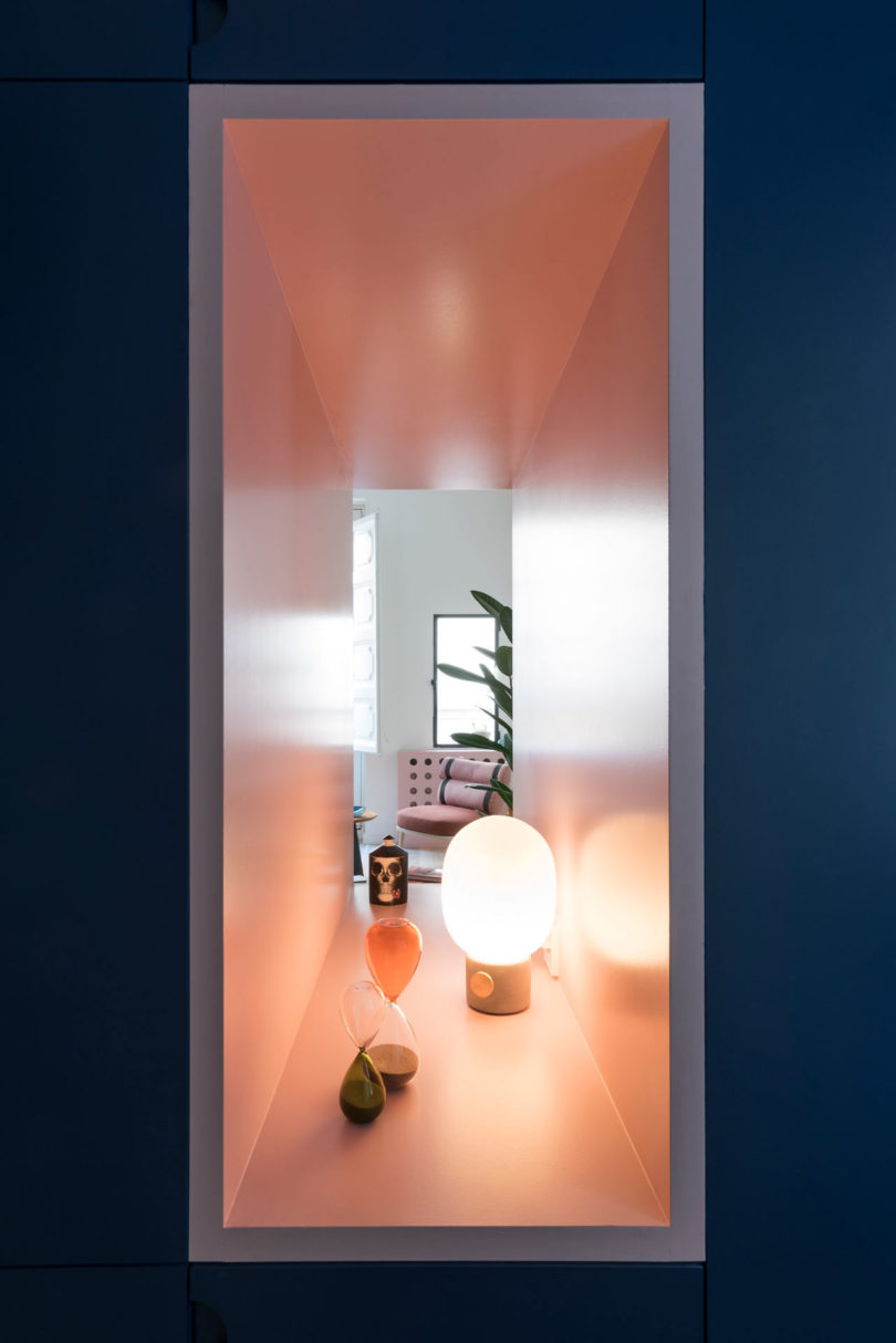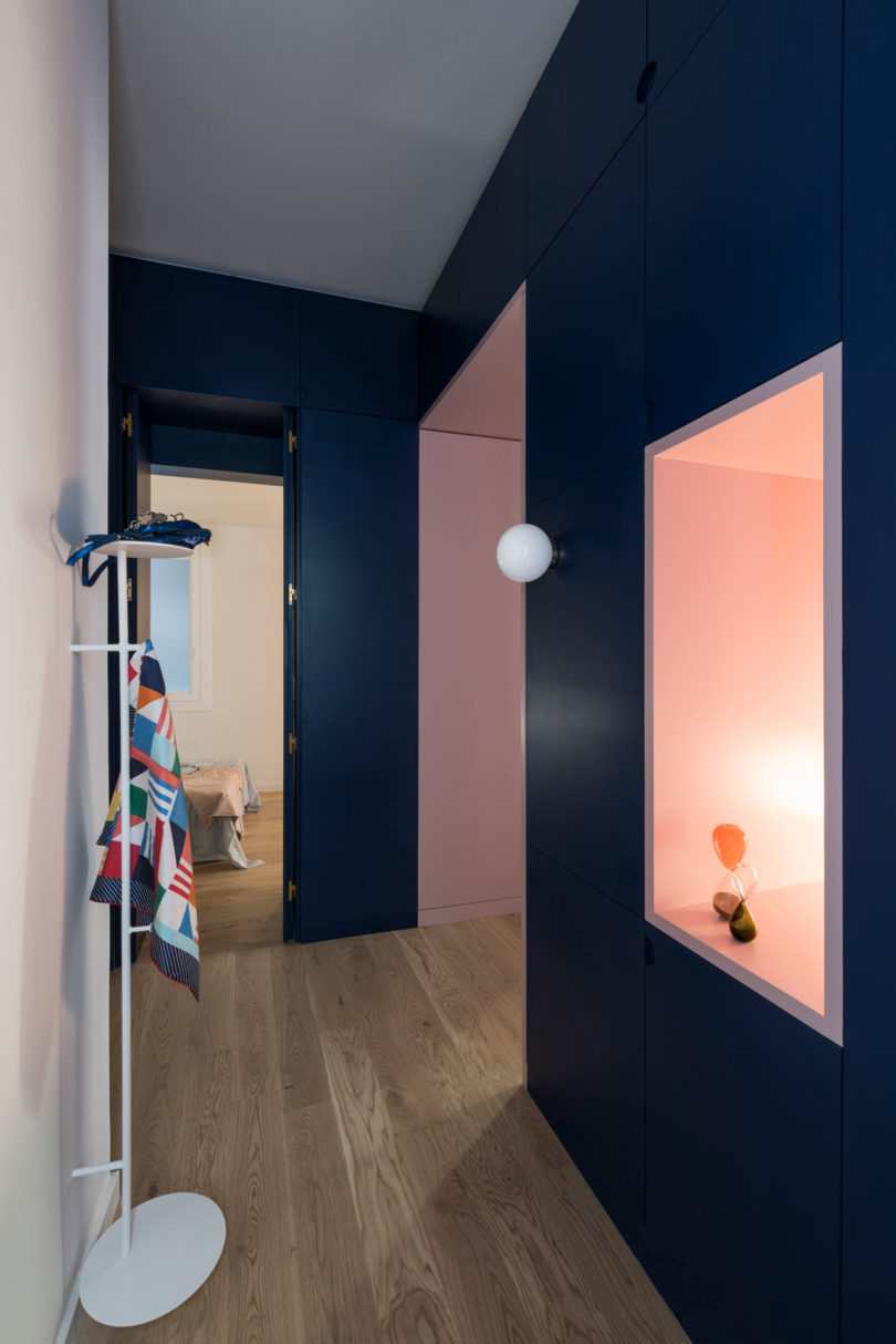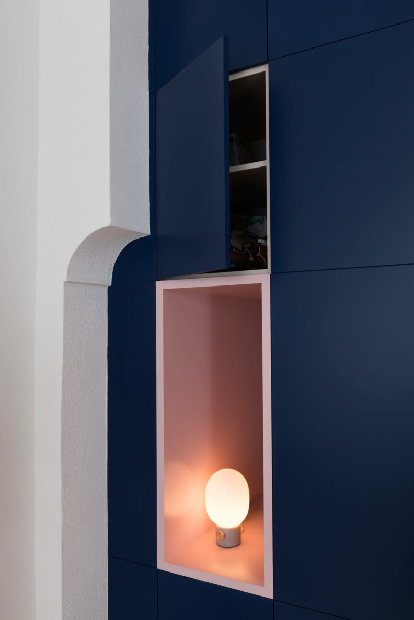 老建筑原有的采光不佳,為了增加采光,設計師做了許多有趣的改變,除了在外墻開設門窗外,作為隔斷的柜體也被做出了通透的壁龕,擺放一盞燈,讓燈光與自然光線點亮原本昏暗的過道。