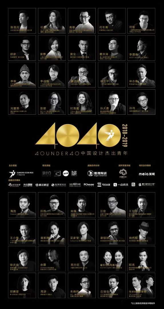 “40 UNDER 40中国设计杰出青年(2018-2019)年度盛典”于11月27-29日在2018广州设计周(广州保利世贸博览馆)举办,展示全国40岁以下的、在室内建筑设计领域最具卓越表现和杰出贡献的青年设计师榜单,并重磅表彰2018年度中国40席40岁(含)以下青年设计领袖榜单,分三天举行开幕礼、专题展览、思想会、颁奖典礼、省际论坛、城际沙龙等系列活动。